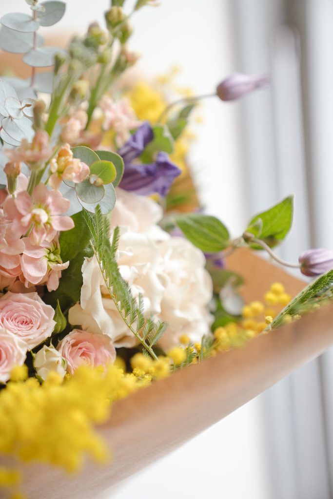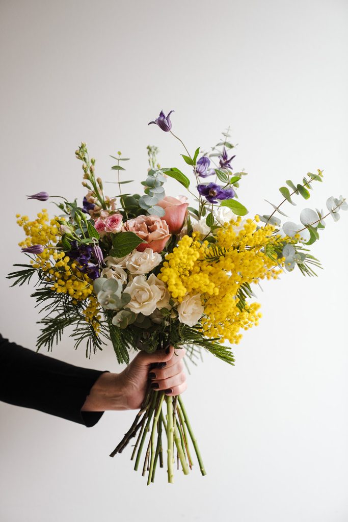 Ramo de 15 tallos de flores de temporada en tonos primaverales. Las flores de la imagen es sólo una muestra de cómo puede ser el ramo, pudiendo sustituirse alguna de ellas por falta de disponibilidad.